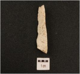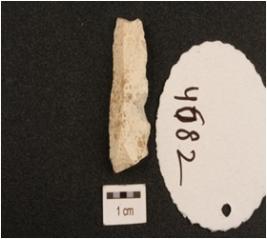 | Description / विवरण | Blade made on end struck chert flake, a prominent ridge on dorsal surface, use wear marks along cutting edges, triangular in section. |