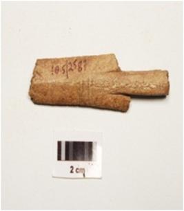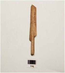 | Description / विवरण | Bone arrowhead with barb and tang, polished and four incisel line on surface. Partly broken shaft and lenticular in section from other end. |