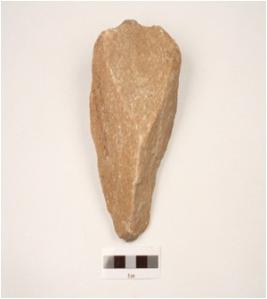 | Description / विवरण | A handaxe made on quartzite end struck flake with use-wear marks on cutting edges, flake scars on both sides, triangular in section. |