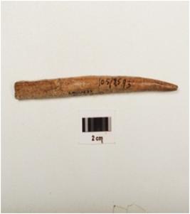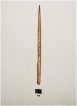 | Description / विवरण | Long bone harpoon with one partly broken barb, polished and incised design on surface, oval in section and partly broken from other end. |