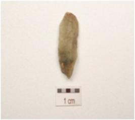| Description / विवरण | Chert blade with a mid ridge on dorsal, diffused bulb on ventral prepared platform, triangular section, use wear marks on cutting edge and slightly broken along distal end. |