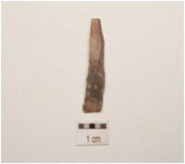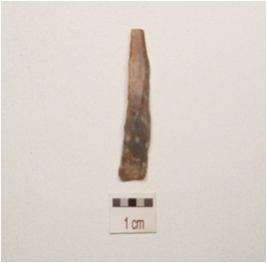 | Description / विवरण | Chert blade with a single ridge on dorsal, diffused bulb on ventral triangular in section, use wear marks on cutting edge and broken along distal end. |