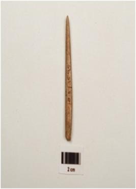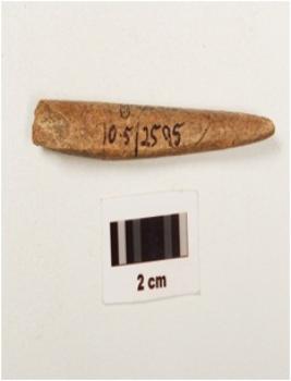 | Description / विवरण | A bone point with polished pointed end, slightly curved and rectangular in section, partly broken from thick end and light brown in colour. |