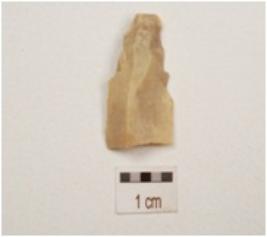 | Description / विवरण | Fragment of chert blade with single ridge on dorsal, triangular in section, diffused bulb on ventral and use wear marks on cutting edge, broken along distal end. |