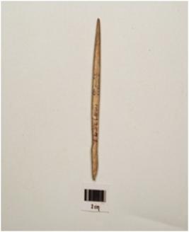 | Description / विवरण | A bone point with partly polished surface, pointed from both ends and oval in section. |