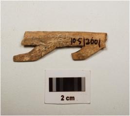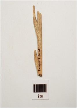 | Description / विवरण | Bone harpoon with two barbs polished surface, square in section , partly broken from both ends and cream in colour. |