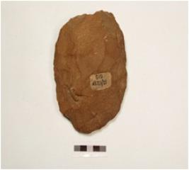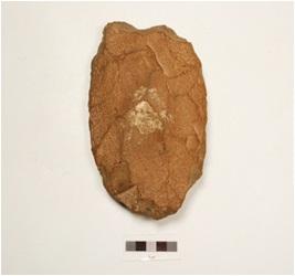 | Description / विवरण | A cleaver made of quartzite pebble, flake scars on both sides, sharp broad cutting edge and biconvex in section. |