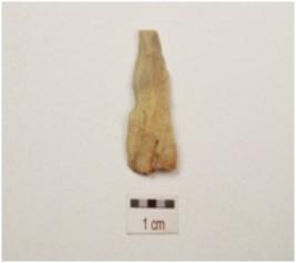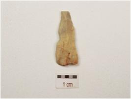 | Description / विवरण | Chert blade with a mid ridge on dorsal diffused bulb on ventral triangular in section, use wear marks on cutting edge and broken along distal end. |