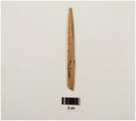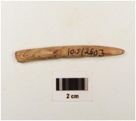 | Description / विवरण | Bone harpoon with one barb, polished and four incised lines on surface, pointed end and circular in section from broken end. |