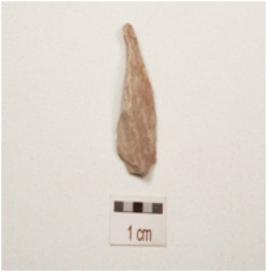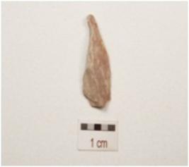| Description / विवरण | Chert blade with a mid ridge on dorsal, triangular in section, diffused bulb on ventral, use wear marks on cutting edge and broken along distal end. |