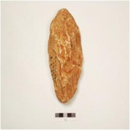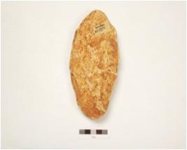 | Description / विवरण | A handaxe made of quartzite pebble, flake scars on both sides and biconvex in section. |