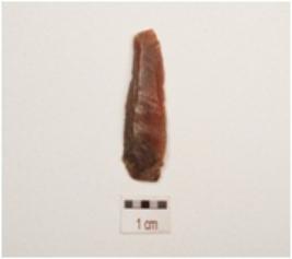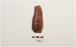 | Description / विवरण | Chert blade with double ridge on dorsal trapezoid in section, ripple marks on dorsal and use wear marks on cutting edge. |
