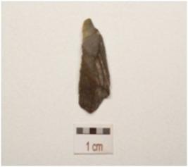 | Description / विवरण | Chert blade with a mid ridge on dorsal, triangular in section, use wear marks on cutting edge and slightly broken along distal end. |