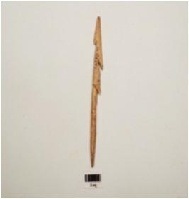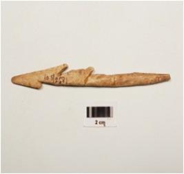 | Description / विवरण | Long bone point with three barbs, polished surface, pointed at one end and triangular in section from broken end, cream in colour, broken and mended. |
