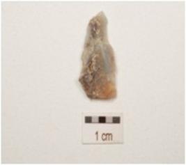 | Description / विवरण | Chert blade with improminent single ridge, pointed distal end, triangular in section broken along proximal end and use wear marks on cutting edge. |