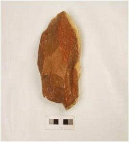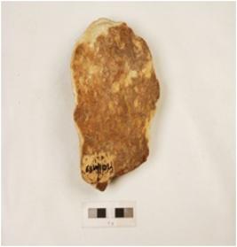 | Description / विवरण | A miniature handaxe made on quartzite pebble by soft hammer technique, flake scars on both side and sharp cutting edges on both sides. |
