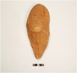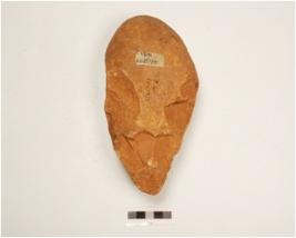 | Description / विवरण | A handaxe made of pebble, flake scars on both sides and biconvex in section. |