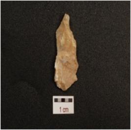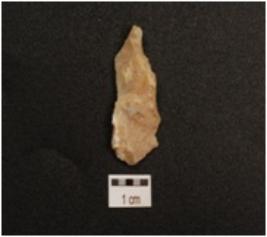 | Description / विवरण | Chalcedony blade with single ridge on dorsal, triangular in section, partly broken along proximal end and use wear marks on cutting edge. |