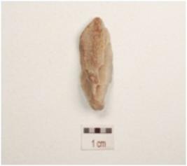 | Description / विवरण | End struck utilized flake made on chert with a ridge on dorsal, triangular in section prepared platform and use wear marks on edges. |