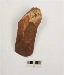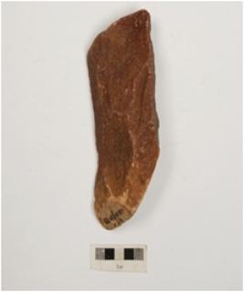 | Description / विवरण | A unifacial side scraper on side struck flake with flake scars, cortex on surface and irregular retouches on cutting edge. |