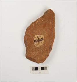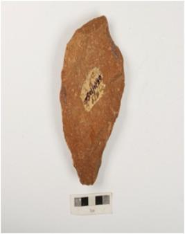 | Description / विवरण | Bifacial handaxe made on quartzite by appling block-on-block technique, flake scars on both sides, one thick end and a working edge. |