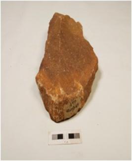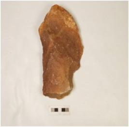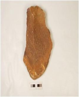 | Description / विवरण | Scraper made on pabble, block-on-block technique, alternate flake scars on surface, cortex visible on one end and irregular retouches on right cutting edges. |