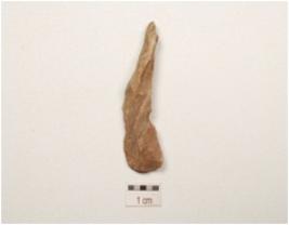 | Description / विवरण | Flake made of chert, mid ridge on the top, use wear marks along the cutting edges. |