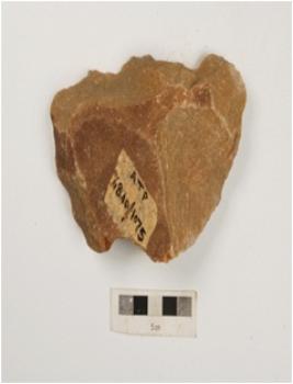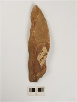 | Description / विवरण | A bifacial handaxe, made on quartzite by applying block on block technique with flake scars on both sides, cortex on dorsal side with a thick end and a sharp working edge. |