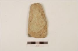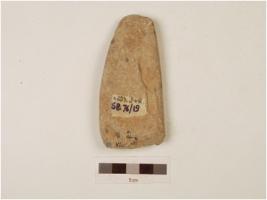 | Description / विवरण | Adze with one side plain, other side convex, broad working edge, narrow at butt end, polished surface, chippings on surface, plano convex cross section. |