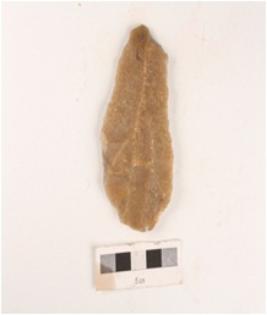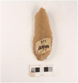 | Description / विवरण | A double sided scraper made on quartzite, unifacial with flake scars on dorsal, prepared platform, irregular retouches on cutting edges and diffused bulb on ventral. |