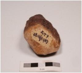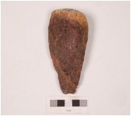 | Description / विवरण | A bifacial hand axe on pebble with two sharp cutting edge and a partly broken pointed top and cortex on another end, small irregular retouches along the cutting edges and soft hammer technique applied. |