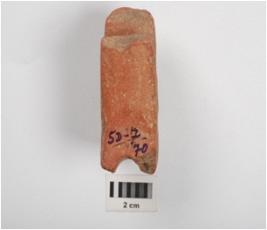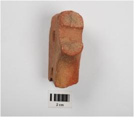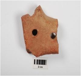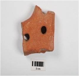 | Description / विवरण | Fragment of handmade terracotta toy cart frame with two perforation on surface. |