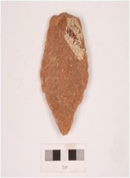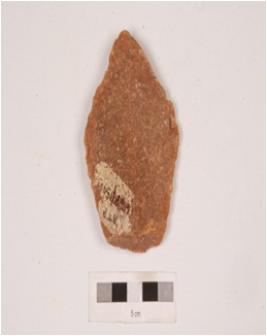 | Description / विवरण | A quartzite side scraper, made on and struck prepared platform, diffused bulb on ventral surface, distal end is broken and irregular retouch at cutting edge. |