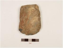 | Description / विवरण | Fragment of a neolithic axe with a broad cutting edge, peckings visible on surface, oval cross section. |