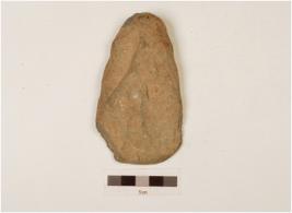 | Description / विवरण | Celt with a broad and convex working edge, pointed butt, chippings on surface, flat at both sides, oval cross section. |