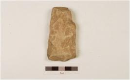 | Description / विवरण | Celt with a unfinished surface, pecking marks visible on surface, rectangular cross section, narrow butt end, broad at other side, blunt working edge. |