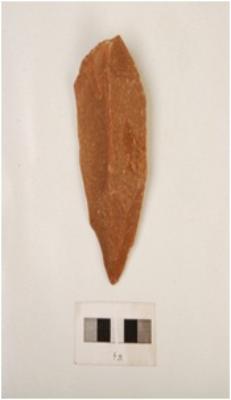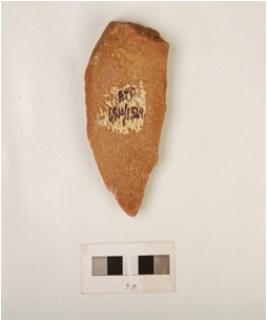 | Description / विवरण | A side scraper made on end struck quartzite flake with flake scars on dorsal side, prepared platform, diffused bulb on ventral side and regularly retouched edges. |