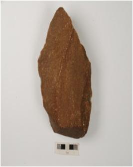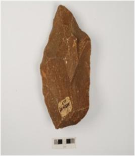| Description / विवरण | Bifacial handaxe, made on quartzite with flake scars on both sides, one thick butt end one pointed working edge with irregular retouches. |