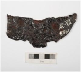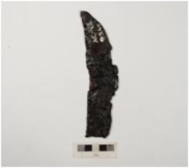 | Description / विवरण | Fragment of an iron sickle. Flattened section from both sides, slightly curved, broken from both ends, smooth surface and chemically treated. |