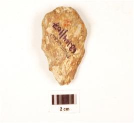 | Description / विवरण | A scraper made on chert-side struck flake, plano-convex in cross section, irregularly retouched working edge, prepared platform, prominent bulb on ventral side and flake scars on dorsal side. |