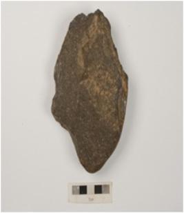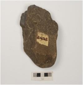 | Description / विवरण | Bifacial chopping tool, made on basalt pebble stone with cortex on dorsal side, flake scars on both sides and irregular retouches on working edge. |
