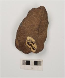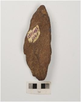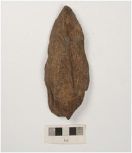 | Description / विवरण | A miniature hand axe flake scars on both side and partly retouched on one end. |