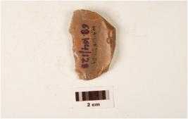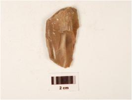 | Description / विवरण | A scraper made on chert end struck flake, bulb absent, plano-convex in cross section, prepared platform, irregularly retouched working edge and blade scars on one side. |