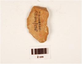 | Description / विवरण | A scraper made on chert end struck flake, irregular retouched working edge, triangular in cross section, prepared platform and prominent bulb on ventral side. |