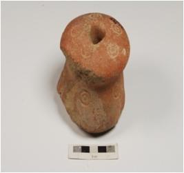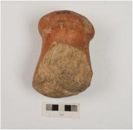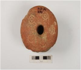 | Description / विवरण | Fragment of terracotta dabber, prominent handle, hole on top incised circlet design on handle. |