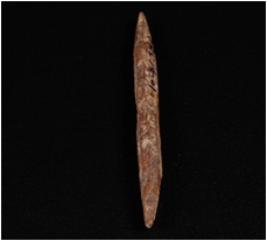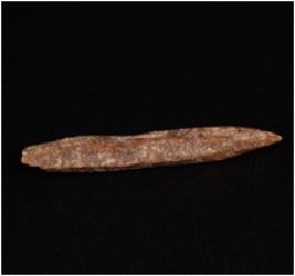 | Description / विवरण | A bone point with pointed tip, dark brown and uneven surface. |