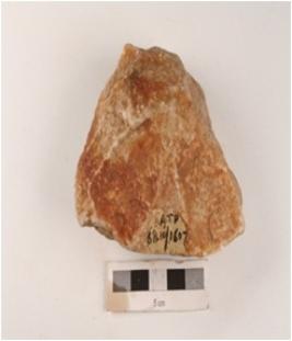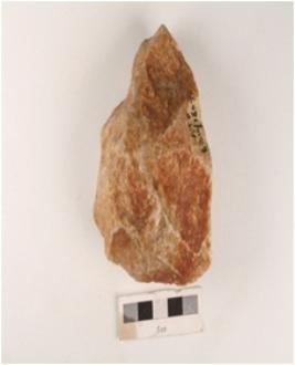 | Description / विवरण | A quartzite chopper, with striking platform, 7 flake scars on one side and 3 flake scars on another side. |