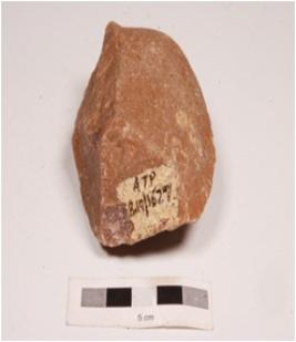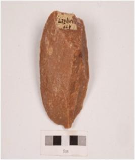 | Description / विवरण | A side scraper, made on end struck flake, prepared platform, diffused bulb on ventral surface and irregular retouch at cutting edges. |