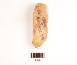 | Description / विवरण | Blade made on chert prepared platfrom and prominent bulb, irregular retouch triangular cross section, and flake scars on one side. |