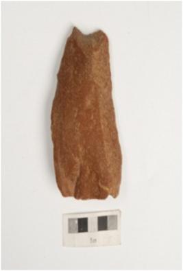 | Description / विवरण | A scraper, made on a side struck flake, bulb on ventral side, flake scars on dorsal side with working edges. |